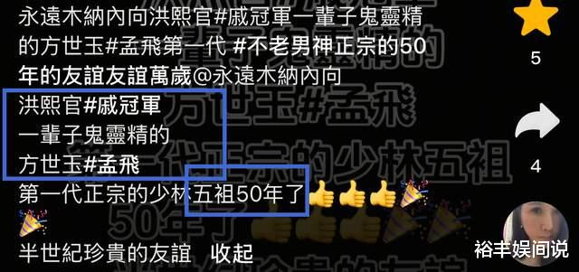 可能很多年轻人不知道,孟飞与戚冠军交往已长达半个多世纪,当年(74年左右),两人联合姜大卫、狄龙以及傅声拍摄了一部《少林五祖》,至今仍然被很多港迷奉为经典,可惜的是,主演傅声早已不在人世。