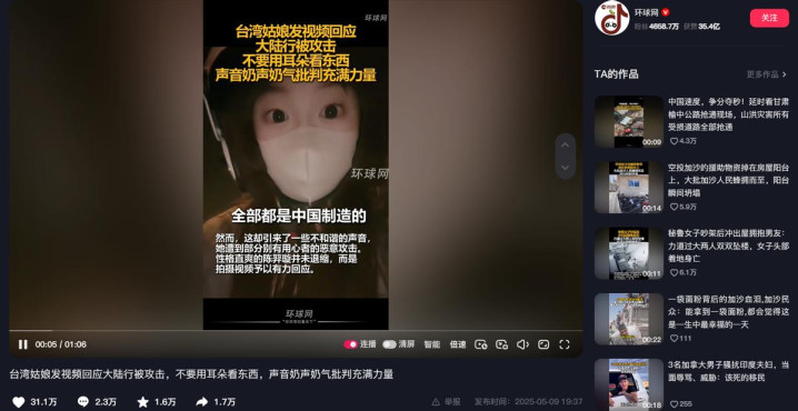 她在视频里,批评台湾歧视大陆的言论,声音奶声奶气,但内容十分有力量。