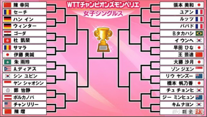 北京时间10月27日,WTT官方已经发布了蒙彼利埃冠军赛的赛程,这一站日乒不管是男单还是女单要进入决赛都没有那么容易(伦敦球星挑战赛女单四强有3人都来自日乒)因为中国队在本站有球员参与,女队:陈熠、陈幸同、王艺迪、蒯曼。