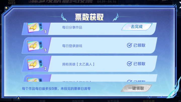 当然,参与这个活动投票,也是需要票的。但是获取票的途径也是比较简单的。比如玩家每日登录游戏、拥有太乙真人、司空震这两位英雄、或者每日分享作品等等,都是可以获得投票的票数的,所以非常的简单。