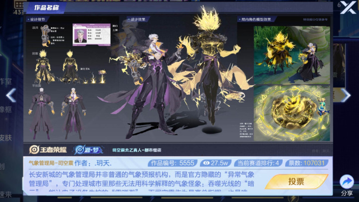 看皮肤特效,其实还是比较不错的,很有质感。这款皮肤的票数是107031。