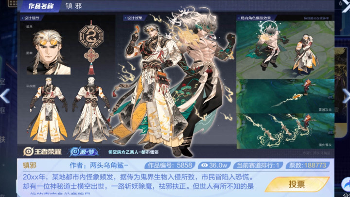 位居第一位的就是上图名为“镇邪”的皮肤,这款皮肤的作者id名为“两头乌角鲨”,目前票数已经有188773票了。这款皮肤司空震相对来说其实也比较朴素,但是设计的相对来说比较古风,所以这可能是玩家们喜欢的主要原因之一。