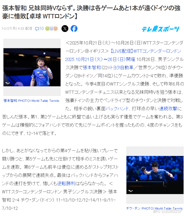 赛后日媒《东京体育新闻》写道:张本智和兄弟无缘一同夺冠,张本智和在决赛中被世界排名较低的邱党击败,他未能追随妹妹的步伐在伦敦站夺冠。文中写道:22岁世界排名第四的张本智和2-4惨败28岁世界排名14的邱党。