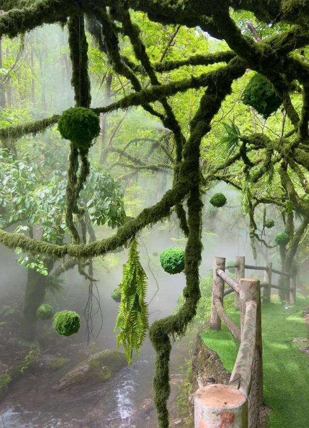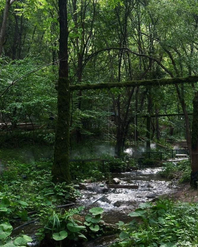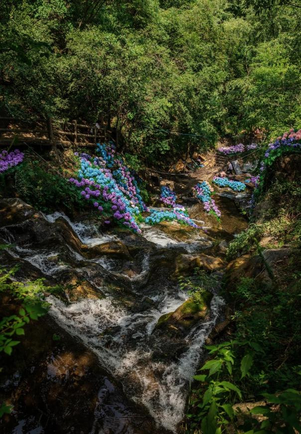脚踩着木栈道,耳边是清泉顺流而下的声音,眼前是偶尔跃出水面的彩色小鱼,鼻腔里混着潮湿空气和竹叶的清香。